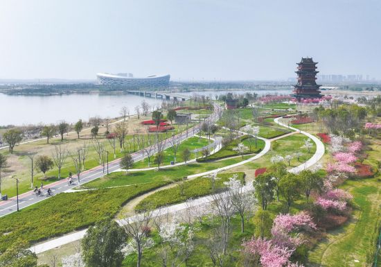 近日,市民在明湖公园骑行。春色肆意,草木生发,在明湖公园滁阳阁附近,樱花、海棠竞相盛开,市民悠游于生态优美的明湖公园,享受春光无限的惬意周末。