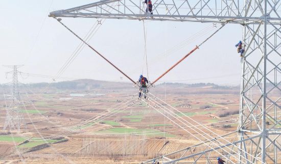 日前,电力工人在对明光市石坝镇境内的香涧至鹭岛500千伏输电线路进行投产验收作业。